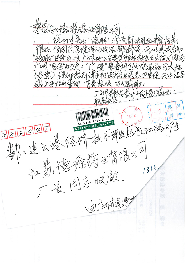 近日,公司收到廣州糖尿病患者李女士寄來的一封書信。信中寫道:“瑞彤”針對2型糖尿病人控制血糖療效顯著。八年來,她一直服用德源公司的“瑞彤”產(chǎn)品,現(xiàn)在血糖得到了很好的控制。但因原取藥的醫(yī)院出現(xiàn)斷貨現(xiàn)象,所以來信懇請告知在哪些醫(yī)院或社區(qū)醫(yī)院能夠買到“瑞彤”。