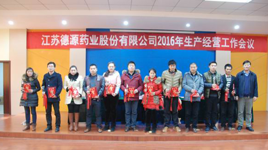2月17日上午,江蘇德源藥業(yè)股份有限公司2016年生產(chǎn)經(jīng)營工作會議在大浦原料藥分公司會議中心召開。會議總結(jié)了2015年生產(chǎn)經(jīng)營工作,布置了2016年生產(chǎn)經(jīng)營工作任務(wù),并對在2015年度中工作積極,表現(xiàn)突出的員工進行了表彰。公司高層領(lǐng)導(dǎo)、銷售公司、獨立辦事處、各管理部門負責(zé)人以及受表彰人員參加會議。