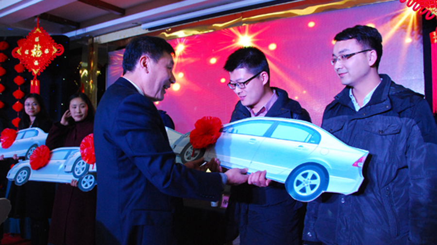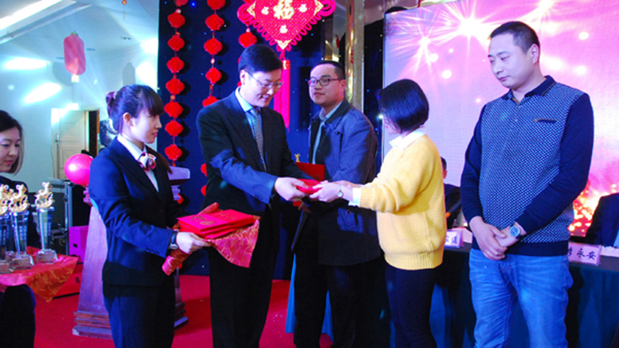 年會由總結(jié)報告、表彰慶功、文藝演出、酒會活動等環(huán)節(jié)組成。年會現(xiàn)場,氣氛激情、熱烈、活躍。陳學(xué)民總經(jīng)理首先總結(jié)回顧了德源藥業(yè)2014年度的各項工作。徐金官副書記宣讀了公司2014年度優(yōu)秀員工的表彰決定,鄭家通副總經(jīng)理對每位受表彰的員工先進(jìn)事跡作了介紹。李永安董事長親自向2014年度業(yè)績突出的6個辦事處頒發(fā)了轎車模型,陳學(xué)民總經(jīng)理、范世忠副總經(jīng)理、徐金官副書記分別為楊海云等12名優(yōu)秀員工、3名優(yōu)秀管理者、2名銷售標(biāo)兵、4名銷售能手、2名銷售進(jìn)步者、1名生產(chǎn)操作能手、1名科技先進(jìn)工作者、1名質(zhì)量管理先進(jìn)工作者和2名安全先進(jìn)工作者頒發(fā)了獎杯和證書,優(yōu)秀員工代表楊海云、董超、李靜、宋明明分別上臺發(fā)表了獲獎感言。