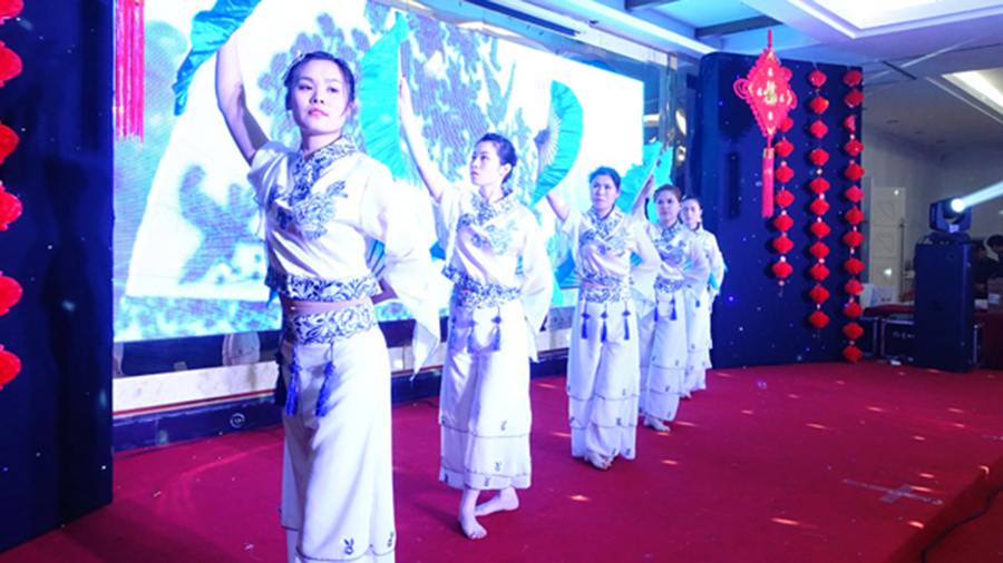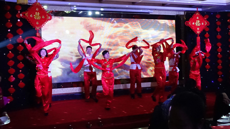 聯(lián)歡會由幸福、丁曄主持。其間穿插了舞蹈、武術(shù)、器樂等表演,整臺聯(lián)歡會的節(jié)目都是由員工和員工的子女表演,形式多樣,精彩紛呈,節(jié)目讓晚會高潮迭起,歌聲、掌聲、歡呼聲不時的在晚會場上蕩漾?! ∮墒袌霾坎邉澅硌莸摹痘糜盎有恪?,利用LED背景墻,將舞蹈剪影與背景畫面融合,創(chuàng)造了魔幻般的表演效果;車間員工劉桂林的兒子李承洋演奏的葫蘆絲曲《月光下的鳳尾竹》,帶來絲絲清爽;車間員工黃瑩、吳新會、苗小紅、張馨月、周艷紅表演的舞蹈《青花瓷》,展示了民族舞蹈的特有魅力;員工武海云兒子李昊洋的八極拳表演,動、靜結(jié)合,舒展大方。另外,員工王丹丹、葛丹、畢龍、薛婧還為大家?guī)砹恕禘vertime》、《愛情?!?、《情非得已》、《萬水千山總是情》等歌曲。